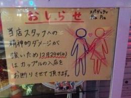 據(jù)香港《文匯報》12日報道,圣誕節(jié)本應(yīng)普天同慶,但對單身人士而言,到處都是成雙成對只能覺得郁悶。日本東京八王子市意式餐廳Pia Pia考慮到在平安夜上班員工的感受,特別在門口貼告示,宣布平安夜當(dāng)日謝絕情侶光顧。 據(jù)報道......