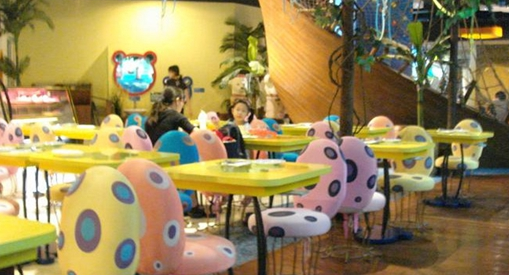 曾經(jīng)紅極一時(shí)的連鎖兒童主題餐廳“芭迪熊”在其第一家店中,讓小朋友吃飯前先進(jìn)行探險(xiǎn)。小朋友們需要登上一條木制“帆船”,開(kāi)始探險(xiǎn)之旅:在沙灘區(qū)有“椰子樹(shù)”和花朵形餐桌;在海洋區(qū),獨(dú)一無(wú)二的水母椅子、可愛(ài)的大蘑菇飲料站都很吸引小朋友。