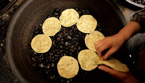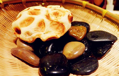 石子饃具有明顯的石器時代“石烹”遺風(fēng),唐代亦稱“石鏊餅”因其是將餅坯放在燒熱的石子上烙制故而得名,又稱砂子饃。石子饃其歷史源遠流長,各地都有,晉陜及中原地區(qū)非常流行,石子饃主要原料是面粉、調(diào)味料和動植物油,石子饃的餅胚放在一鍋又黑又圓的石子上面,烤出來的面餅外觀焦黃鮮亮,中凹邊突,咬開后層次分明,外酥內(nèi)軟。石烙工藝講究傳熱均勻,火力不能太小或太大。太小則無焦香味,更無酥脆的質(zhì)感,太大則外焦而內(nèi)不熟,對成品外型也會有很大影響。由于石頭本身是熱的良導(dǎo)體,傳熱均勻迅速,使烹調(diào)時間得以有效地縮短。在生產(chǎn)資料極端匱乏的古代,采用石烹技法是個聰明又健康的方法。