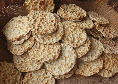現(xiàn)在出門,能吃到現(xiàn)打的燒餅已經(jīng)不多了,但是加工好的石子饃卻經(jīng)常能買到,買上一袋子酥香的石子饃,不論是淡嘴吃,還是抹點腐乳辣醬之類的,都非常搭調(diào)。加了餡料的石子饃,如酥飴的糕點,而我曾經(jīng)用原味的石子饃配食豬頭肉,簡直是人間至味。