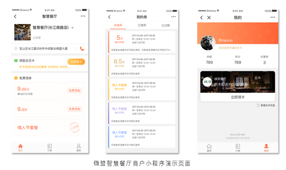 據(jù)了解,餐飲商戶通過微盟智慧餐廳后臺(tái)發(fā)布餐廳的智店小程序,智店小程序不僅能與商家的公眾號(hào)相互跳轉(zhuǎn),而且與智慧餐廳系統(tǒng)互通。目前小程序與公眾號(hào)已實(shí)現(xiàn)會(huì)員、訂單、權(quán)益等的數(shù)據(jù)互通。當(dāng)用戶進(jìn)入商家的小程序時(shí),系統(tǒng)自動(dòng)識(shí)別用戶的會(huì)員身份,并且自動(dòng)同步該用戶的訂單權(quán)益數(shù)據(jù)。用戶在小程序領(lǐng)取的優(yōu)惠券和會(huì)員卡與公眾號(hào)同步;同樣,用戶在公眾號(hào)里領(lǐng)的券和卡,在小程序里也能查看和使用。值得一提的是,由于微盟智慧餐廳的卡券能力與微信原生卡券體系打通,因此通過小程序領(lǐng)取的卡券可以直接添加到微信卡包。據(jù)介紹,后續(xù)微盟智慧餐廳的點(diǎn)餐、外賣等功能也將與小程序打通,屆時(shí)小程序的連接能力將幫助餐飲商戶連接更多的餐飲消費(fèi)場(chǎng)景。